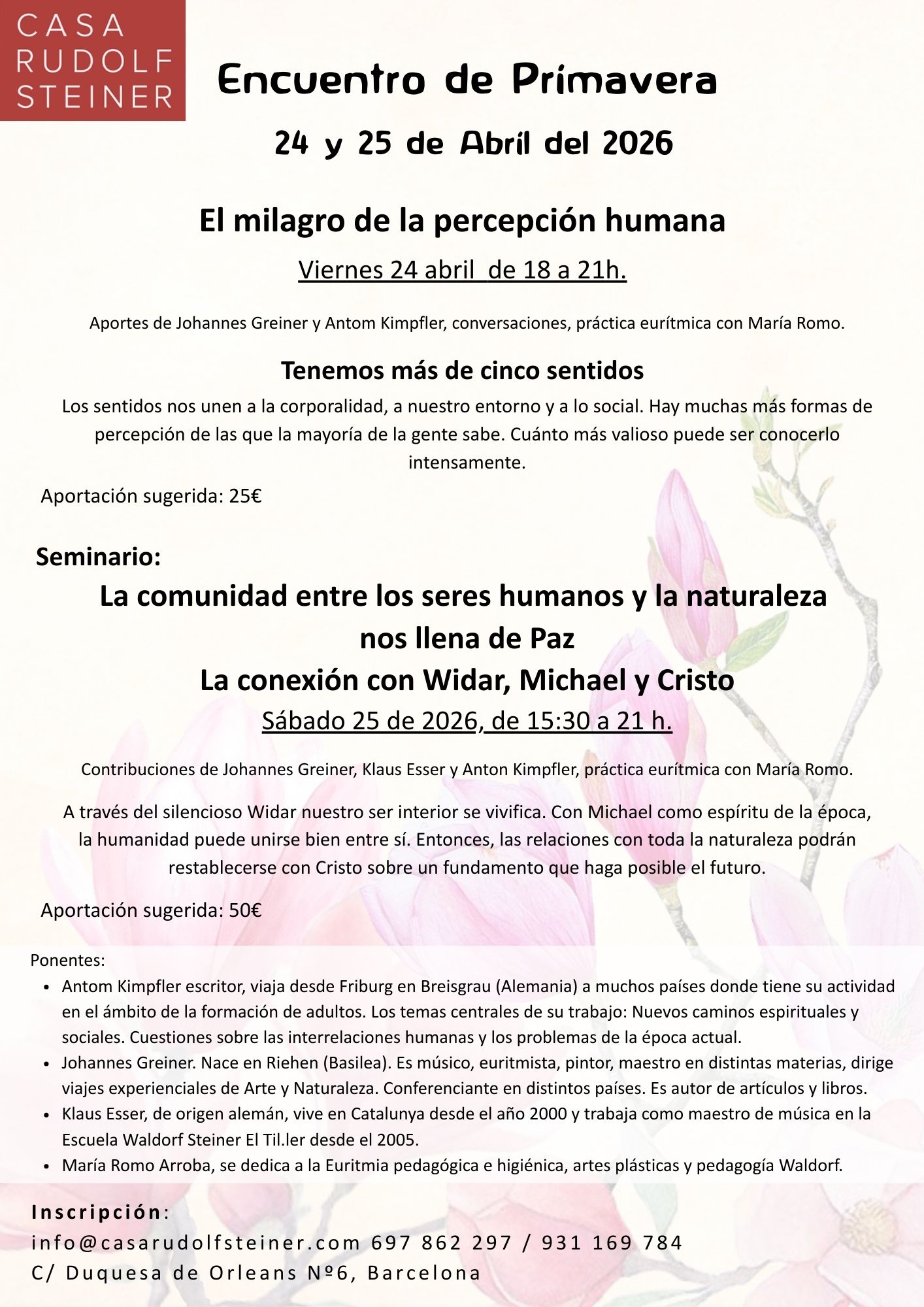 abril 7 @ 7:15 pm - 8:45 pm Introducción a la antroposofía 2 Casa Rudolf Steiner Carrer Duquesa d´Orleans, 6, Barcelona, Barcelona, Spain